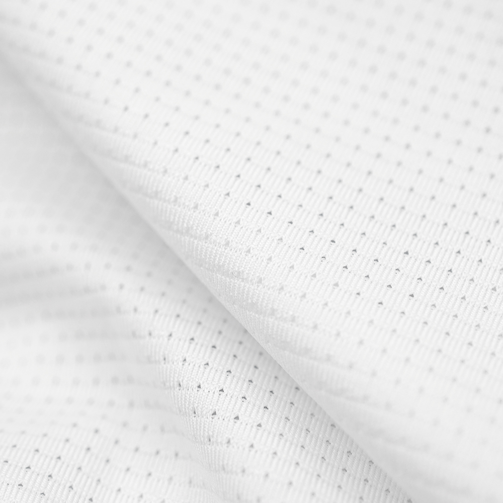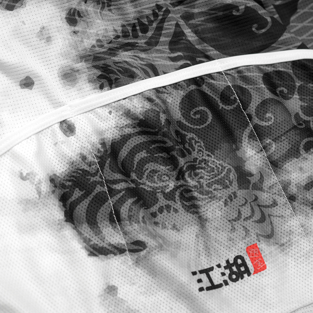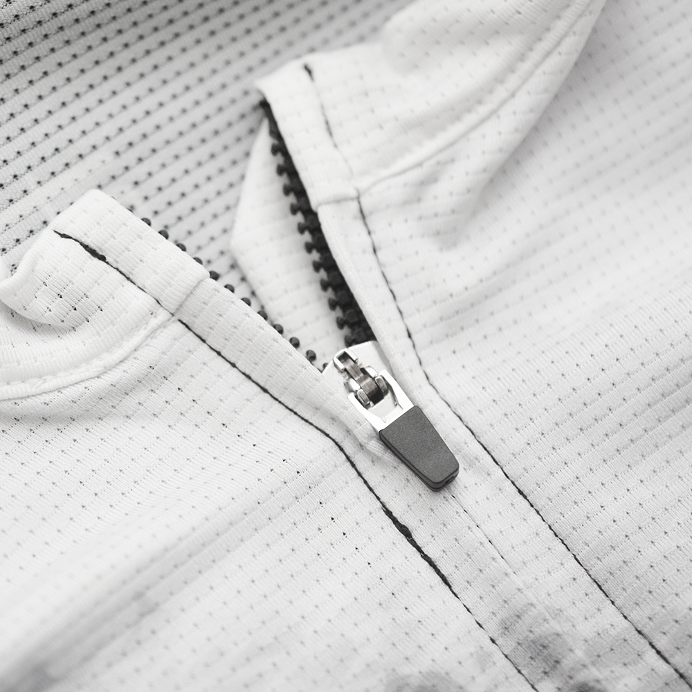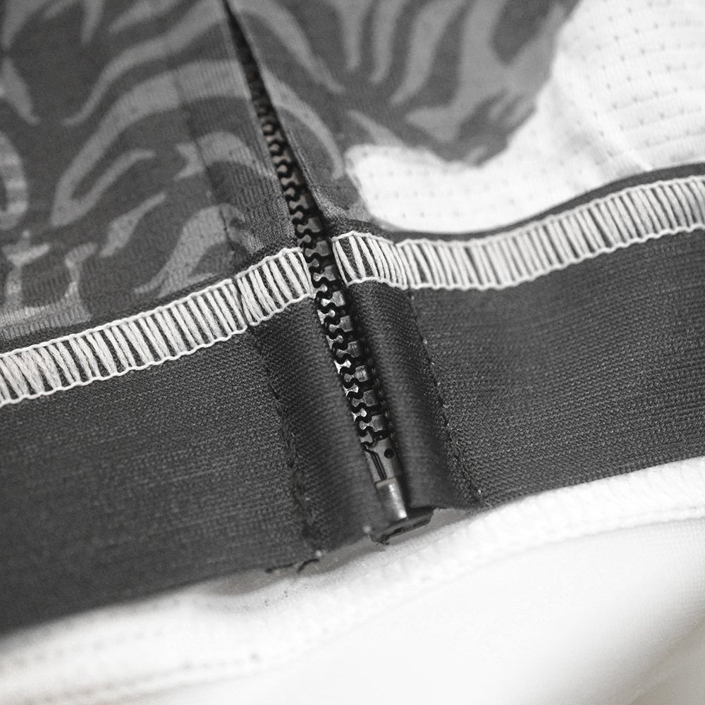 大身、袖臂、側片部位各採用義大利進口透氣輕簿彈力布;下擺鬆緊帶採用義大利MAB 鬆緊帶;輕質透氣、兼顧肌膚舒適度及緊緻貼身剪裁的車衣