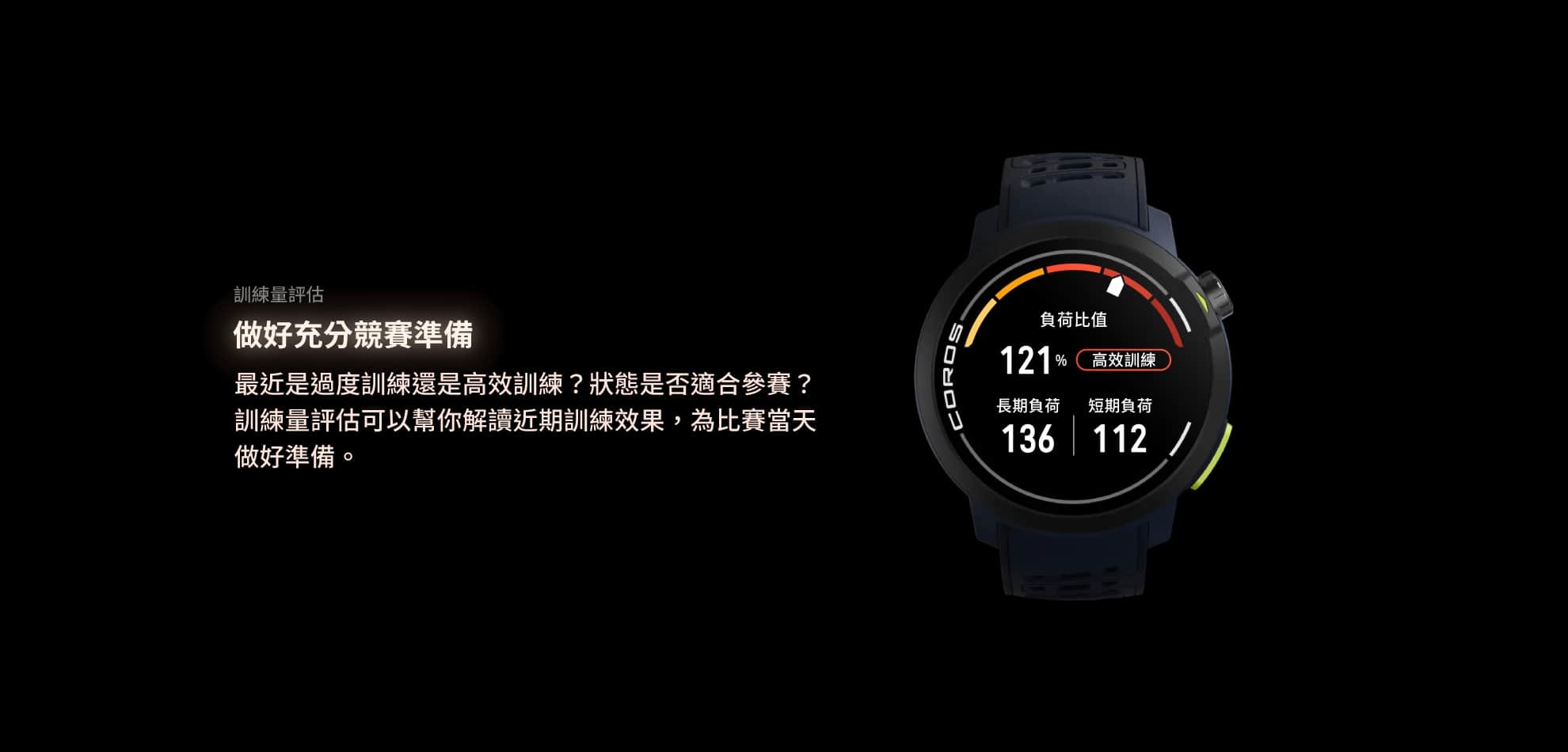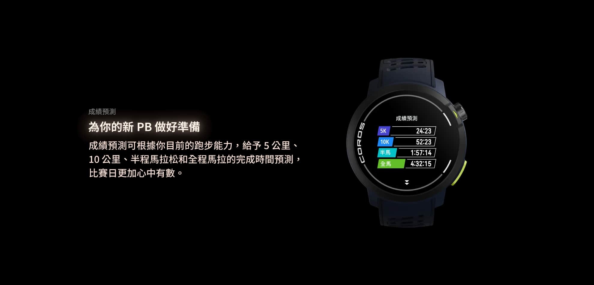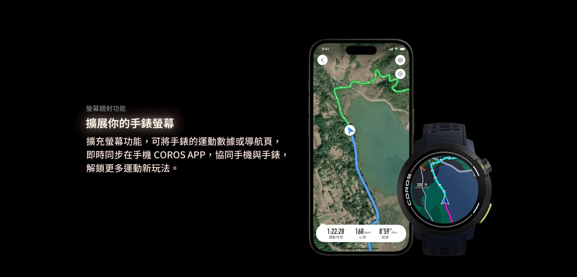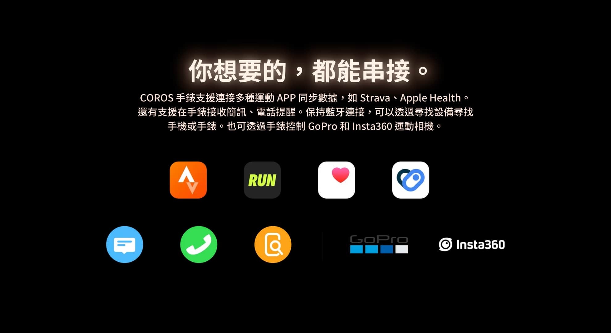 | 日常功能 | 訊息/電話提醒 (日常和訓練期間) 睡眠與 REM (快速動眼期) 追蹤 鬧鐘 碼錶 倒數計時器 每日活動提示 (燃燒卡路里、運動時間、步數...) 藉由 COROS APP 更新韌體 尋找我的手機 尋找我的手錶 背光隨顯 音樂 (配對藍牙耳機,播放離線MP3音樂) |