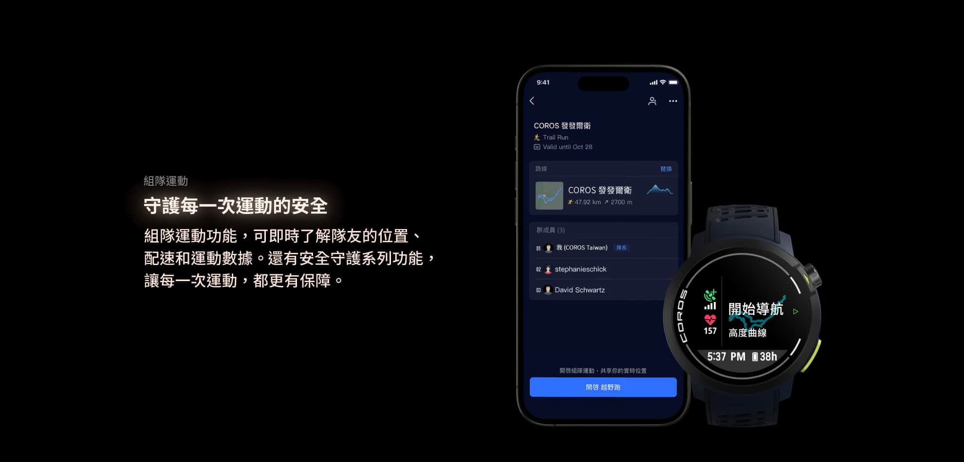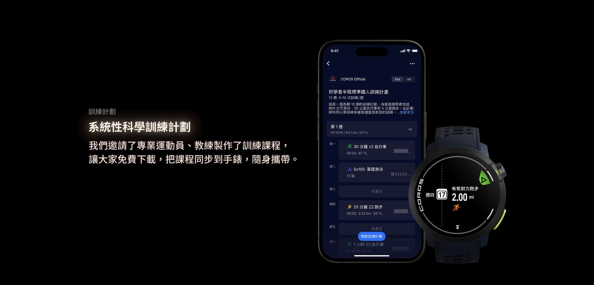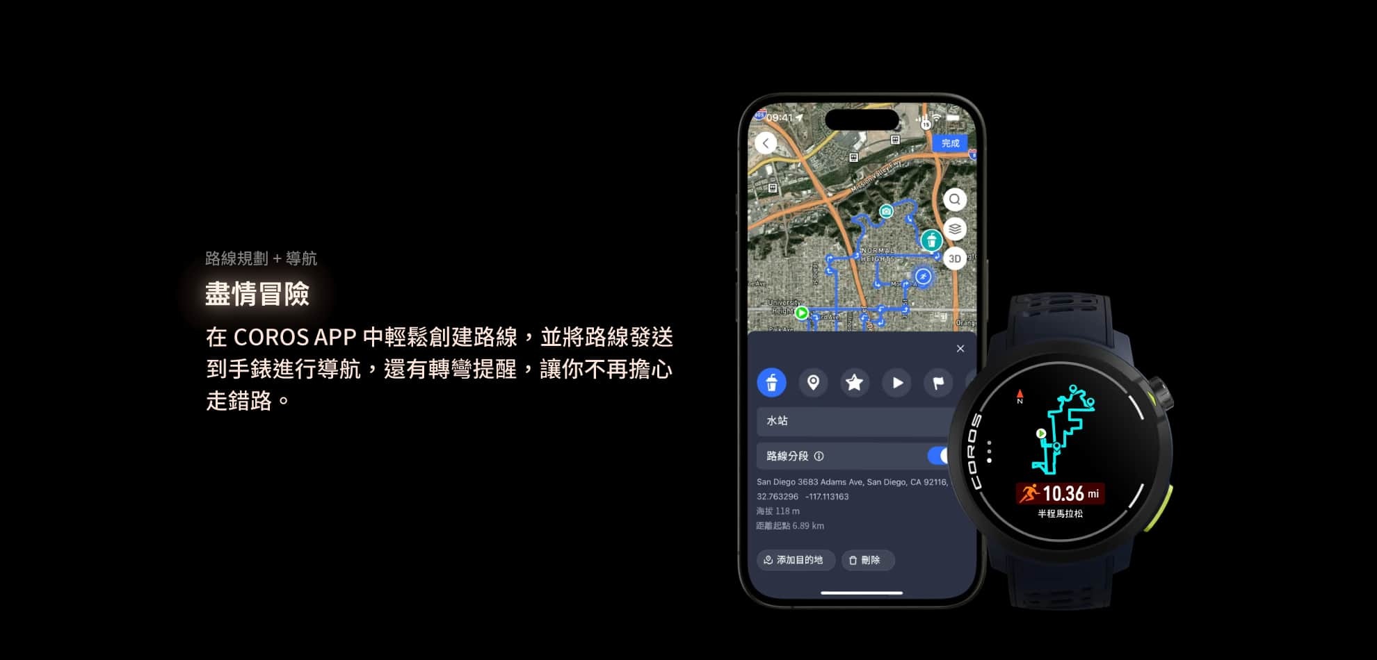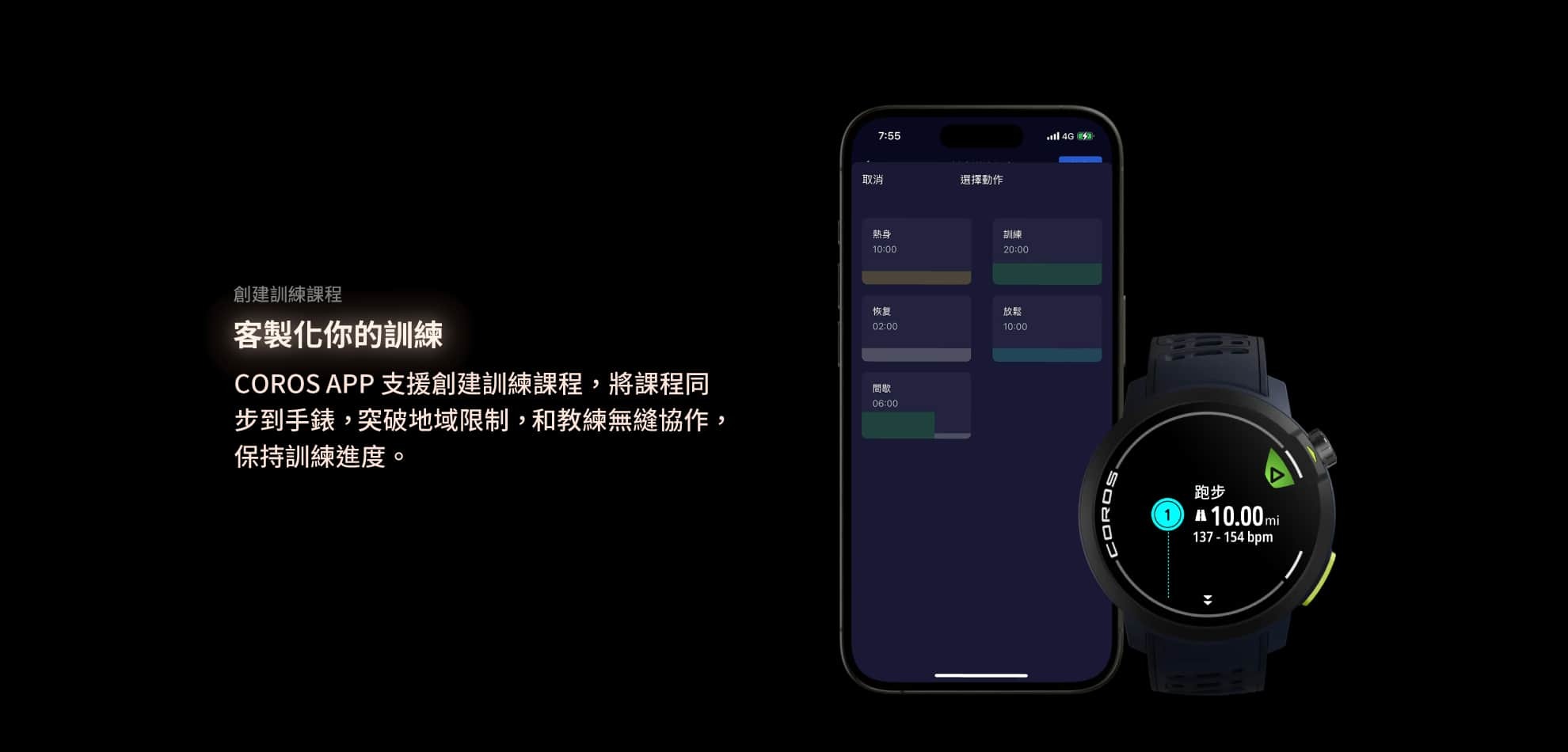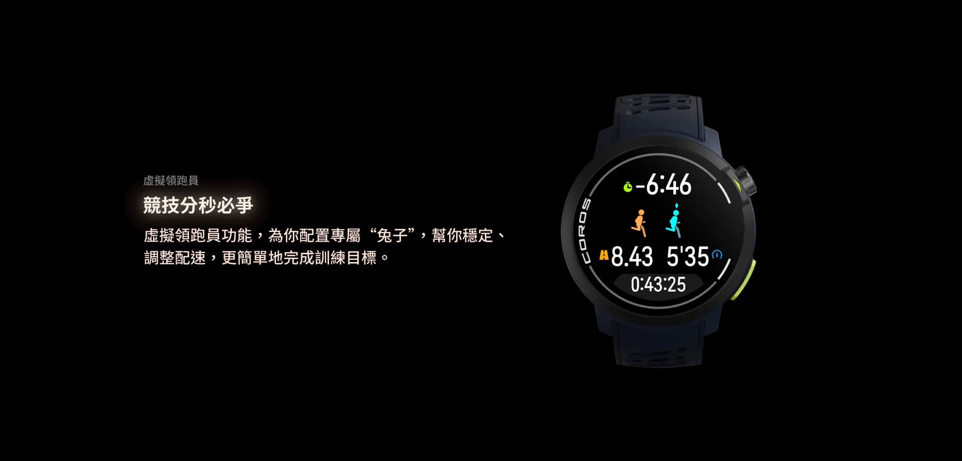 | 日常功能 | 訊息/電話提醒 (日常和訓練期間) 睡眠與 REM (快速動眼期) 追蹤 鬧鐘 碼錶 倒數計時器 每日活動提示 (燃燒卡路里、運動時間、步數...) 藉由 COROS APP 更新韌體 尋找我的手機 尋找我的手錶 背光隨顯 音樂 (配對藍牙耳機,播放離線MP3音樂) |