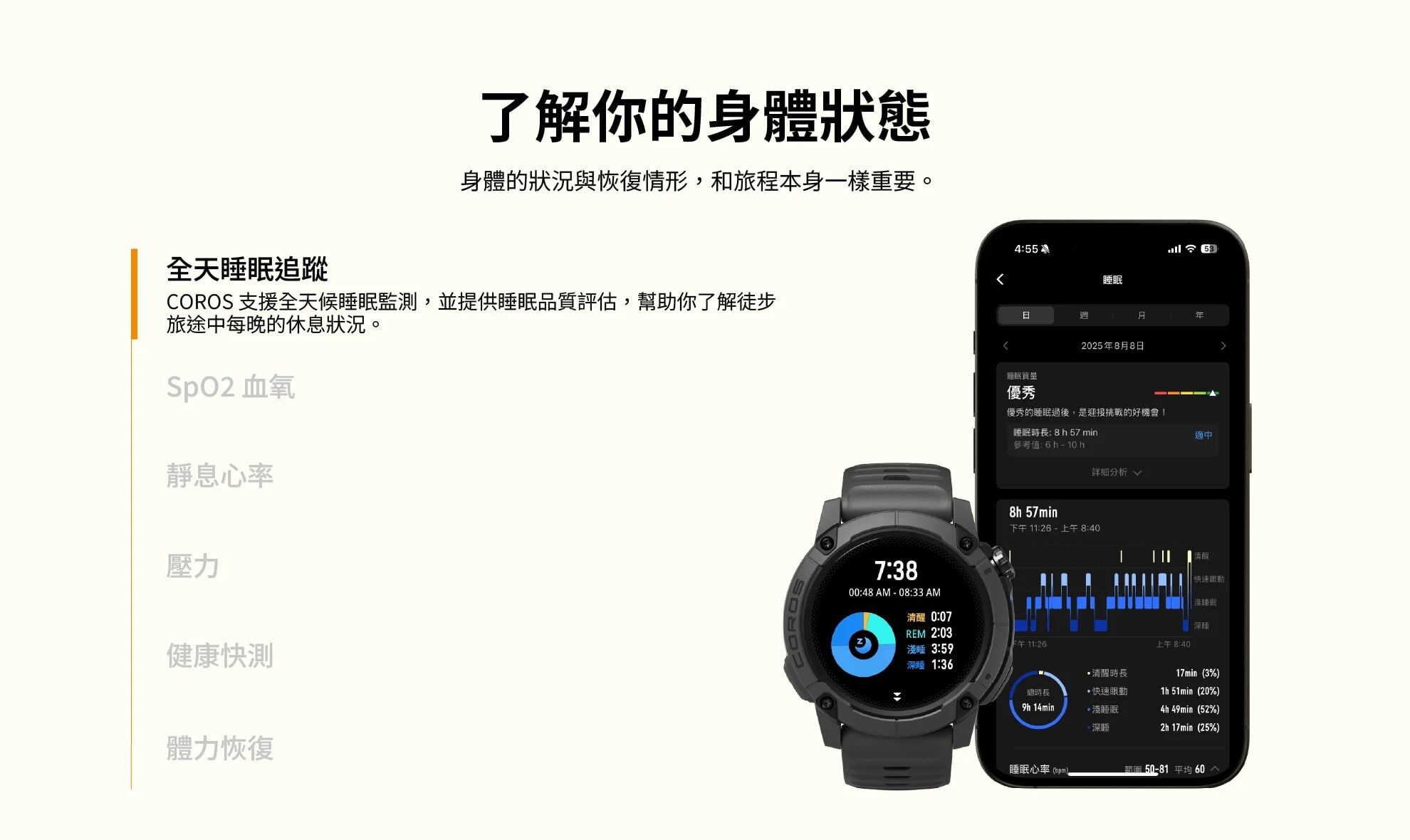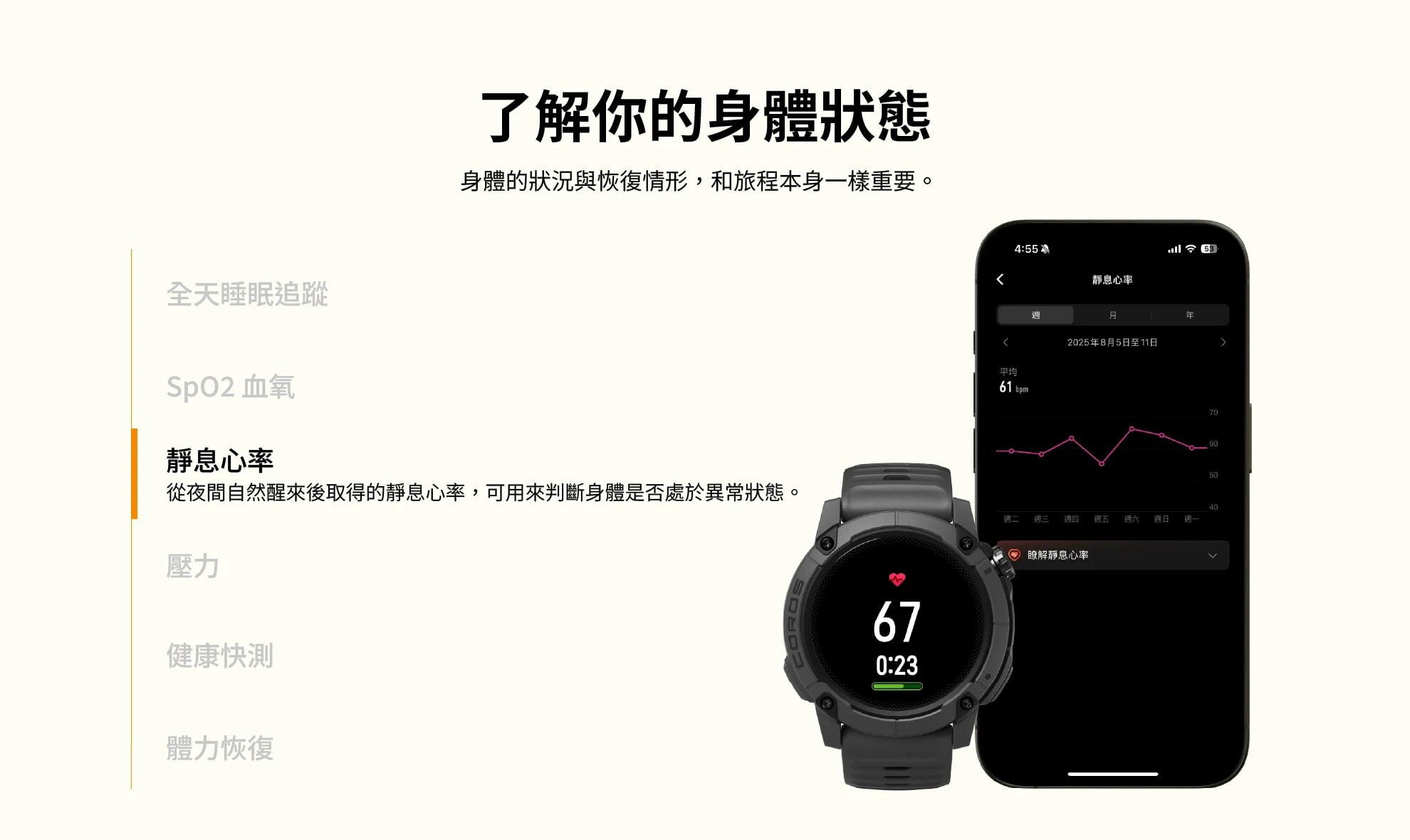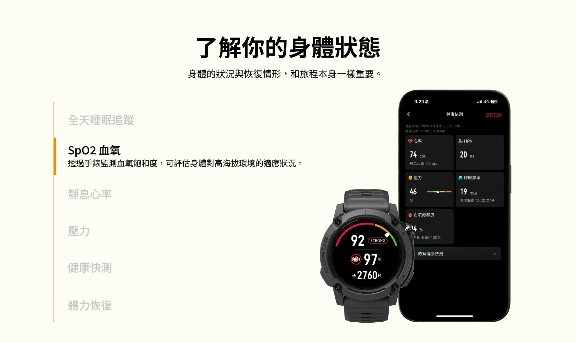 ・全天候健康監測:睡眠、SpO₂、心率、HRV、壓力