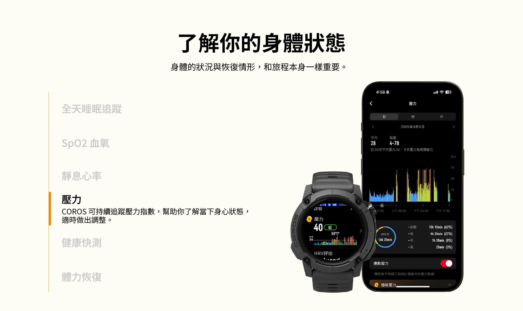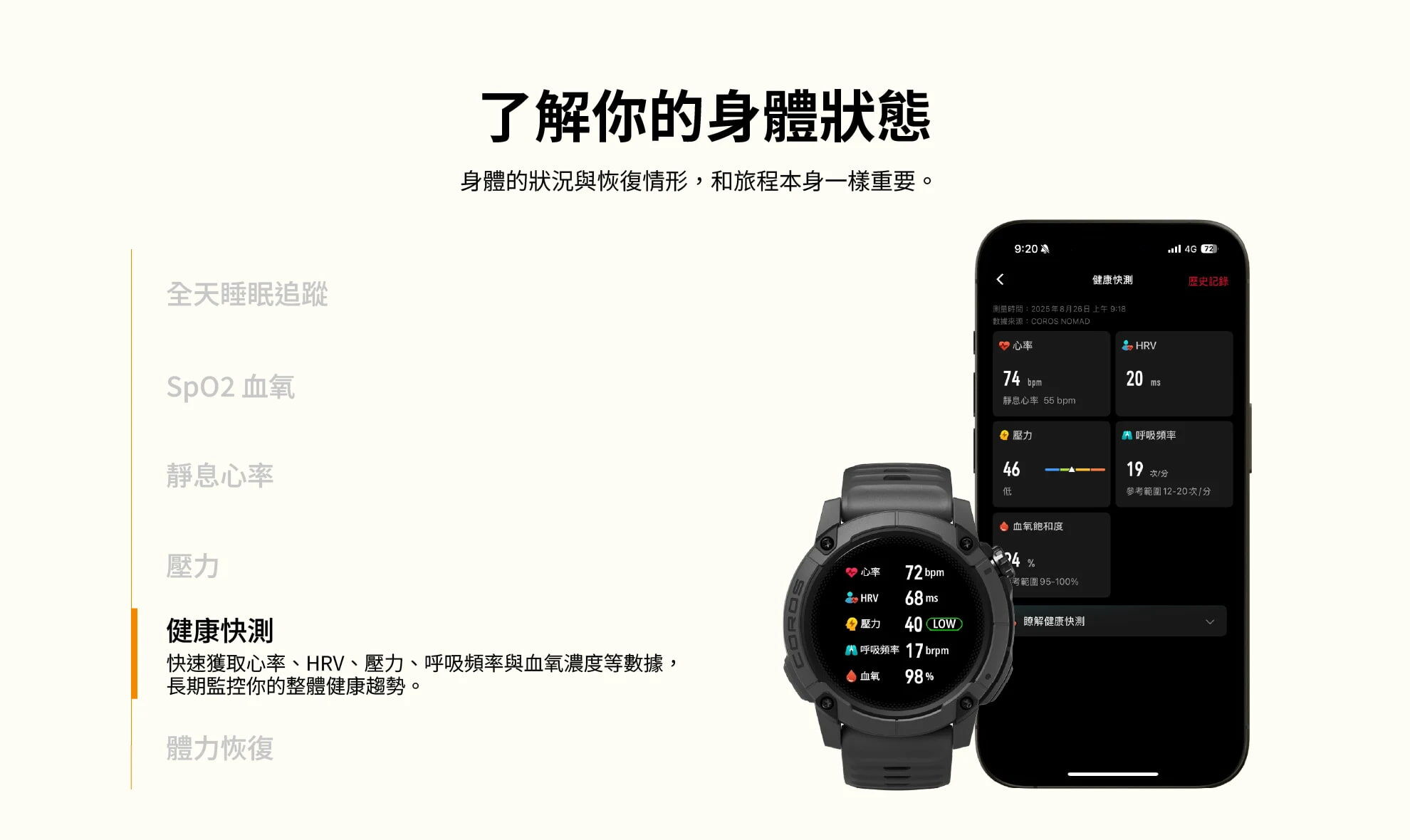 ・全天候健康監測:睡眠、SpO₂、心率、HRV、壓力