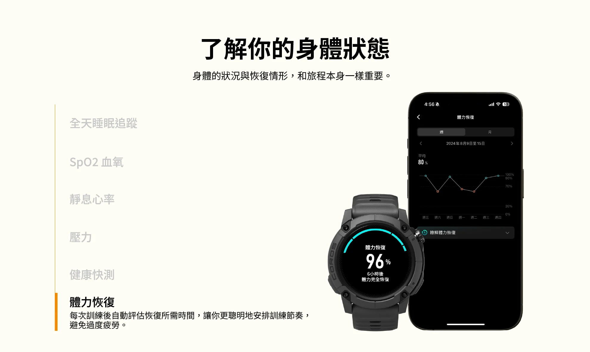 • COROS 穿戴裝置非醫療器材,無宣稱療效亦無血壓或心電圖量測功能,不可用於診斷、治療、緩解或預防任何疾病,僅供運動及休閒使用。光學脈搏心率、血氧、身體負擔及壓力相關指數僅供參考及日常生活健康管理用途,並非醫療診斷或醫師處方,請勿根據測量結果診斷或調整藥物,應依照醫師的指示和規定服藥。