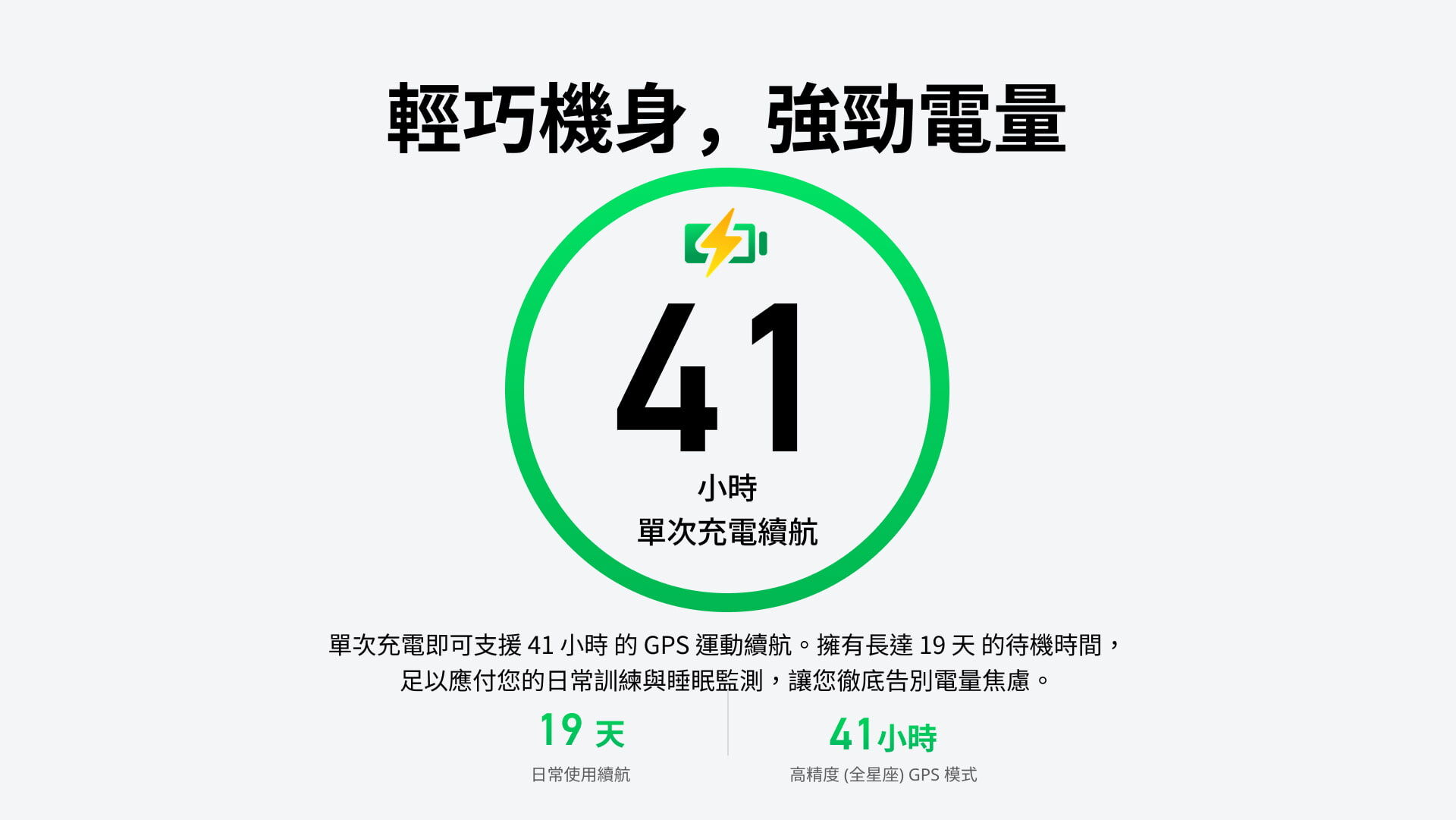 ・運動續航力長達 41 小時,日常使用長達 19 天,您的訓練不再受充電器的限制
