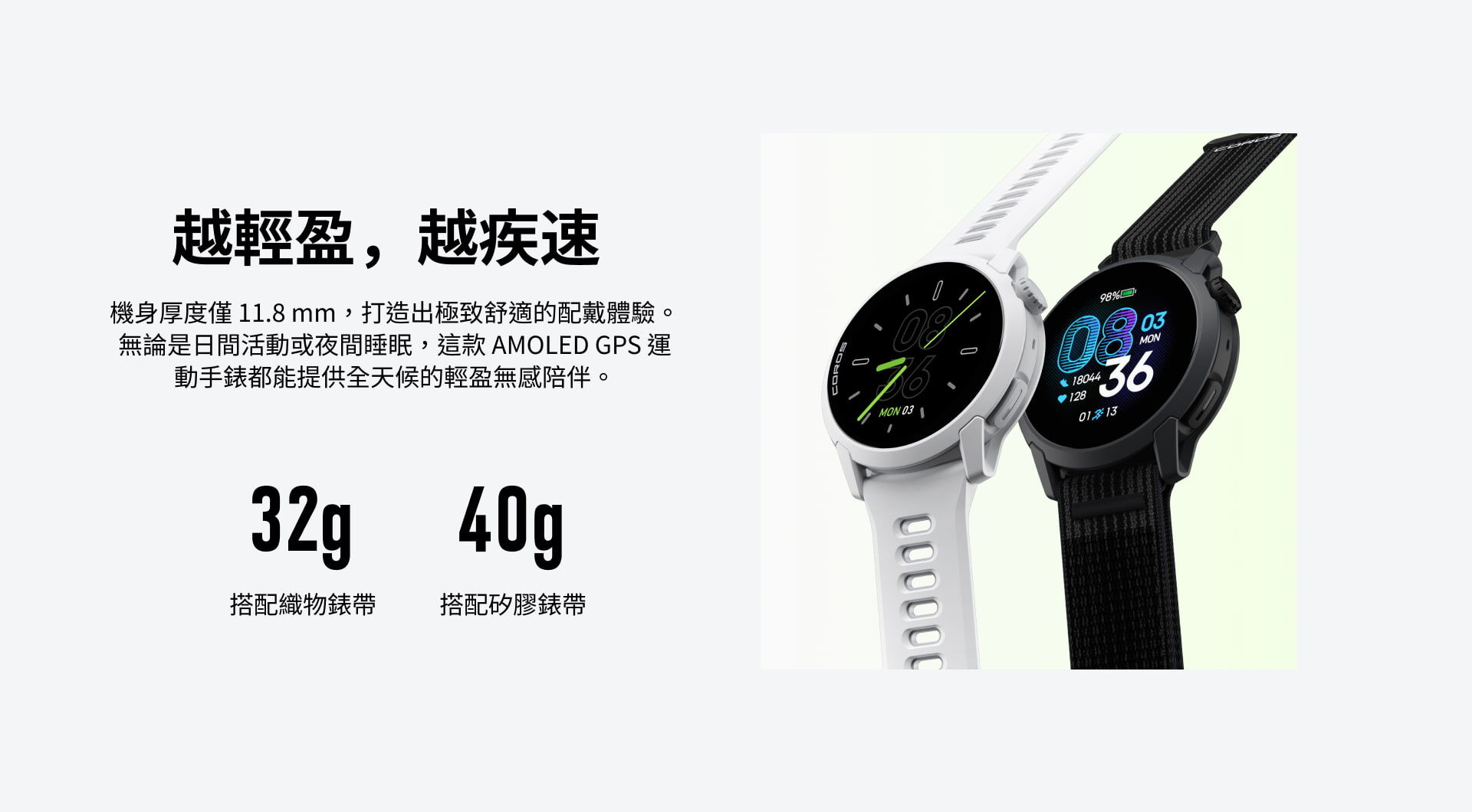 ・織物錶帶款僅重 32 公克,超輕設計,全天穿戴舒適;矽膠錶帶款僅重 40 公克