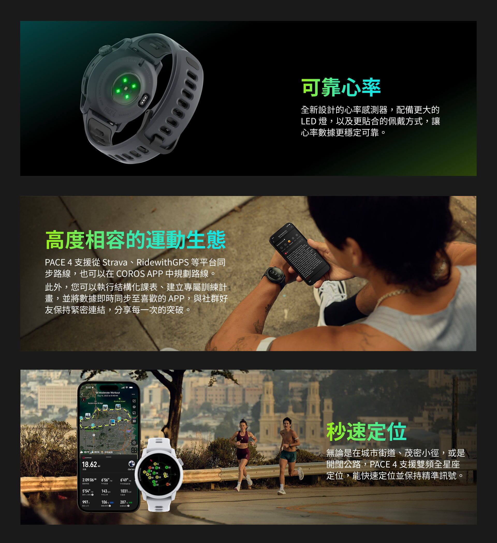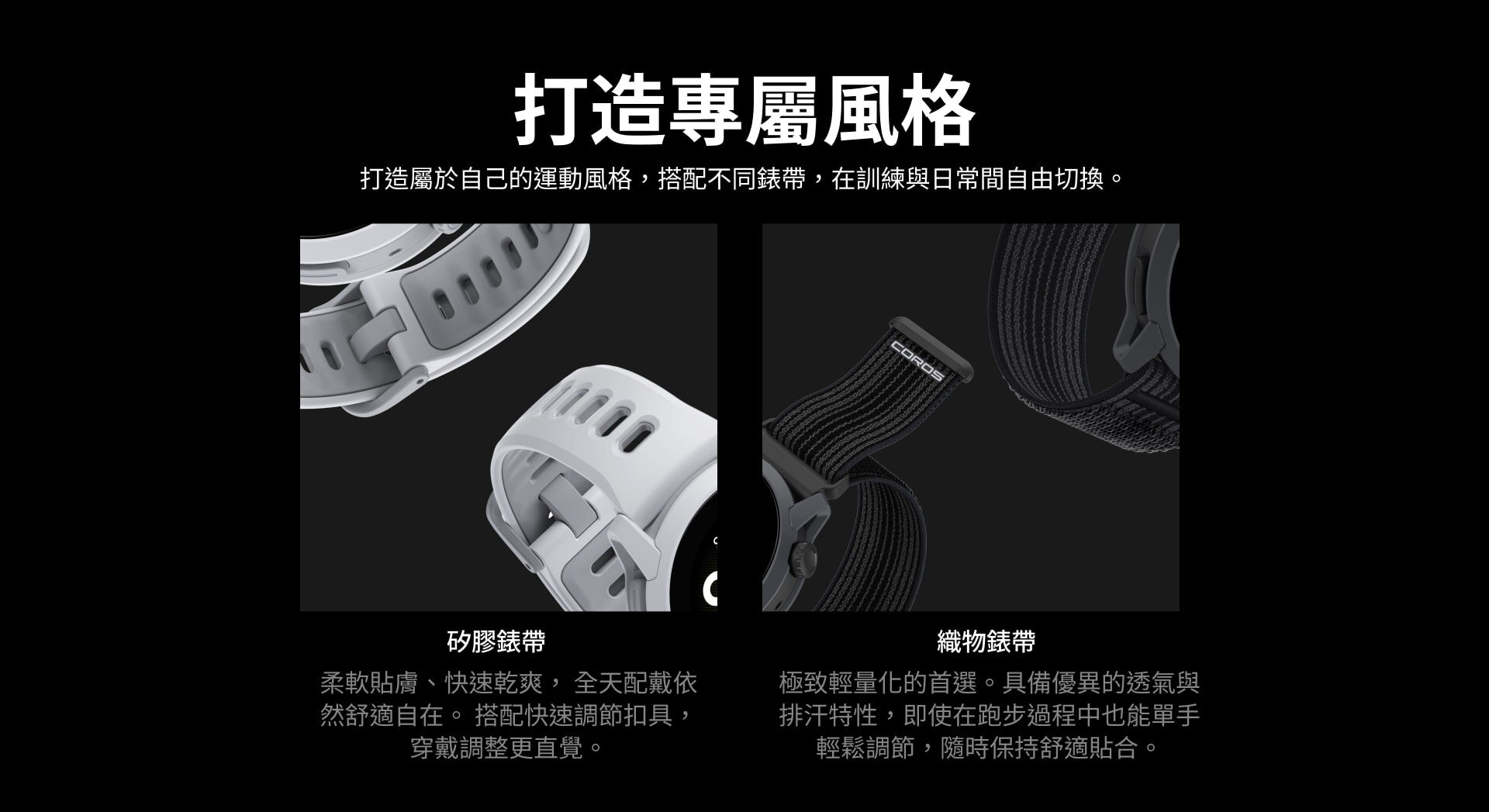 • COROS 穿戴裝置非醫療器材,無宣稱療效亦無血壓或心電圖量測功能,不可用於診斷、治療、緩解或預防任何疾病,僅供運動及休閒使用。光學脈搏心率、血氧、身體負擔及壓力相關指數僅供參考及日常生活健康管理用途,並非醫療診斷或醫師處方,請勿根據測量結果診斷或調整藥物,應依照醫師的指示和規定服藥。