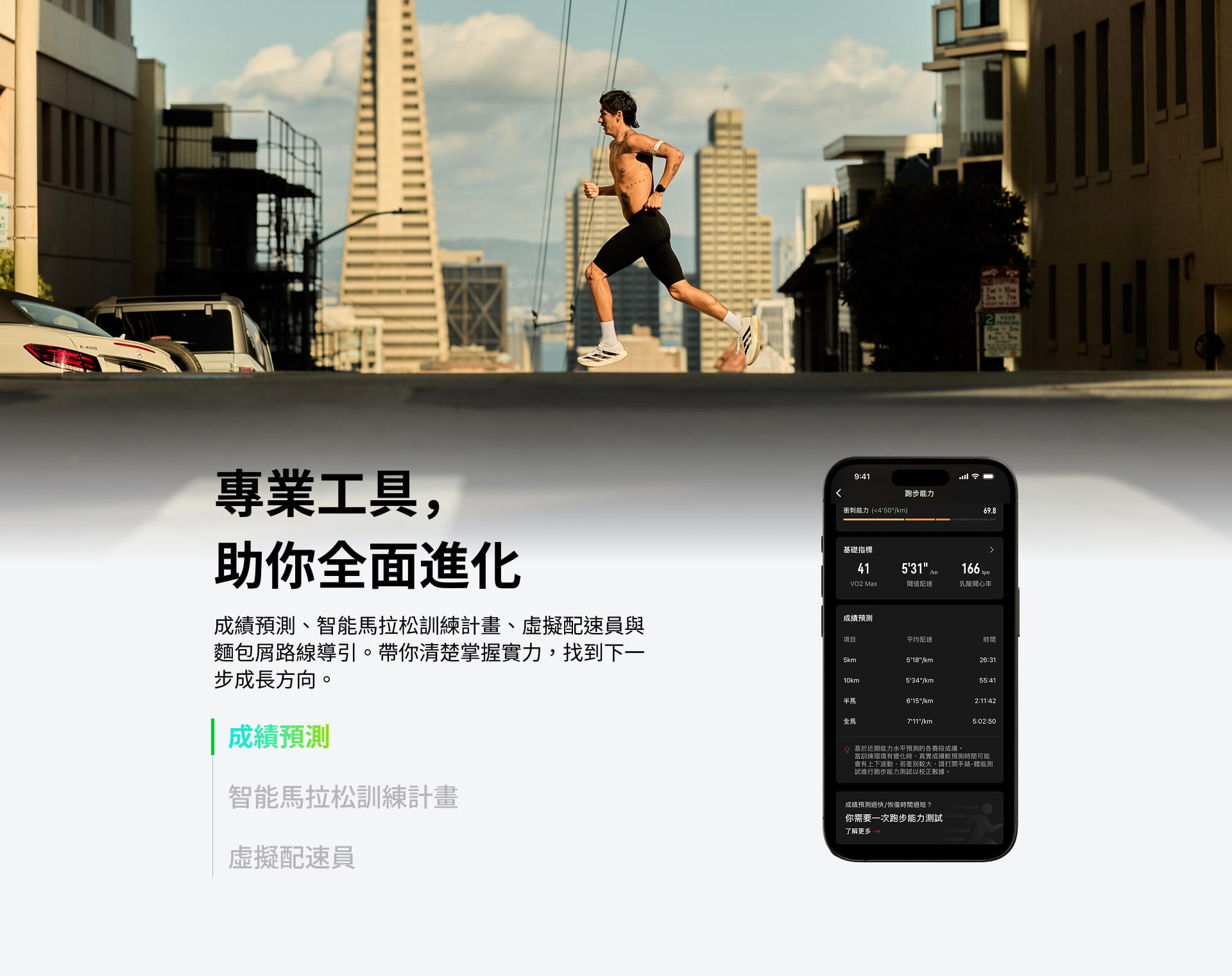 ・跑步體能訓練、比賽預測、虛擬配速員和個人化馬拉松計畫等進階工具可幫助您突破個人最佳成績