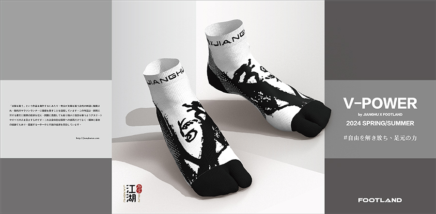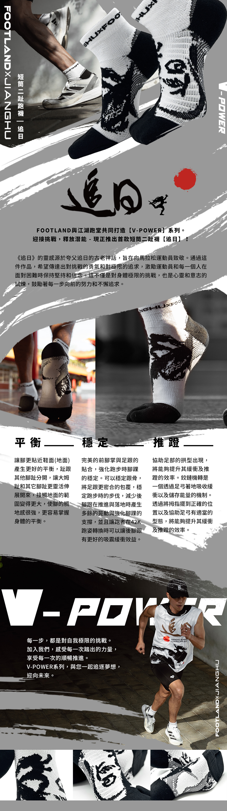首度攜手 FOOTLAND 機能運動襪,共同打造【V-POWER】系列。迎接挑戰,釋放潛能 - 現正推出首款短筒二趾襪【追日】!