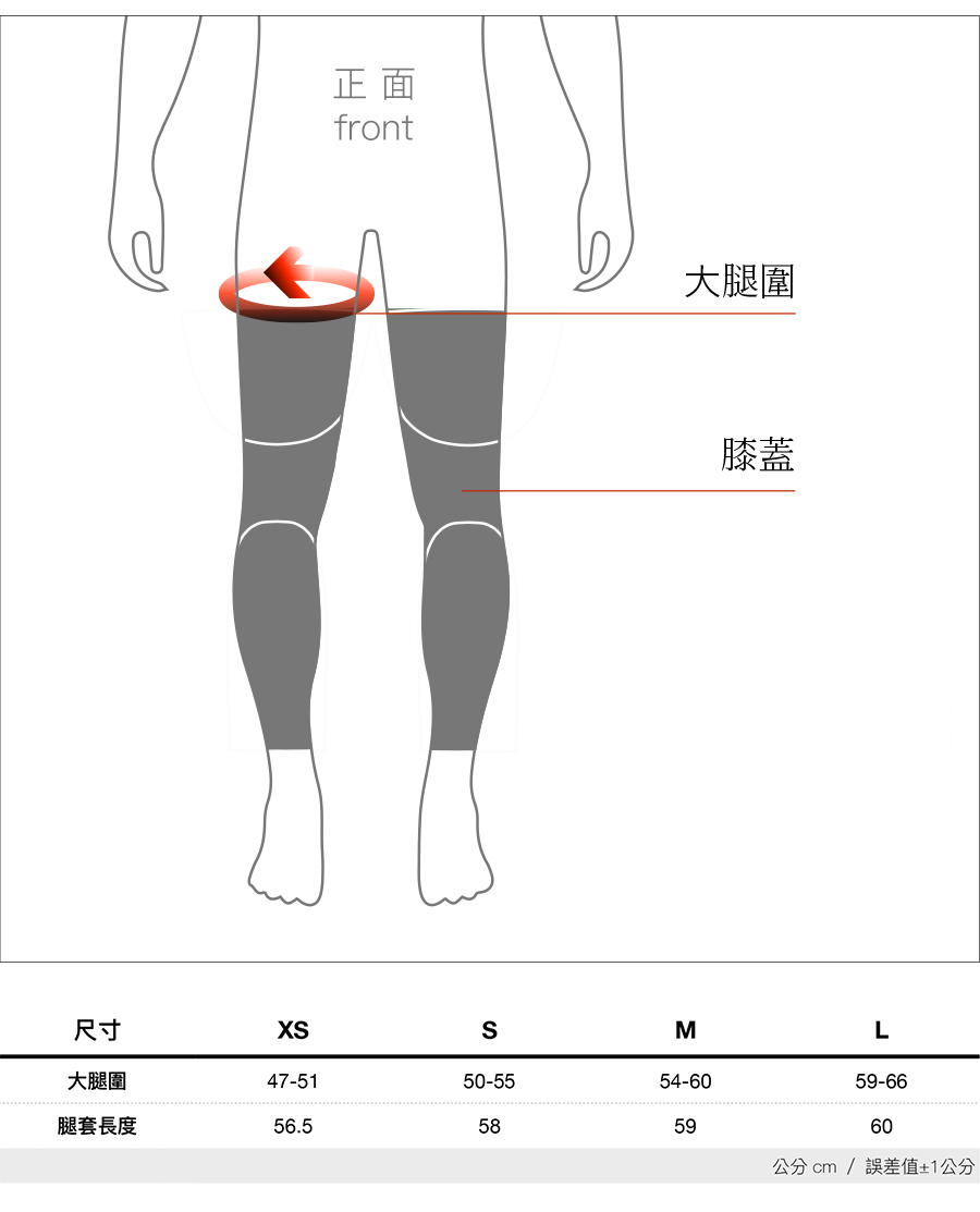 .大腿圍測量方式:膝蓋上方、約大腿2/3處,環繞圈量。