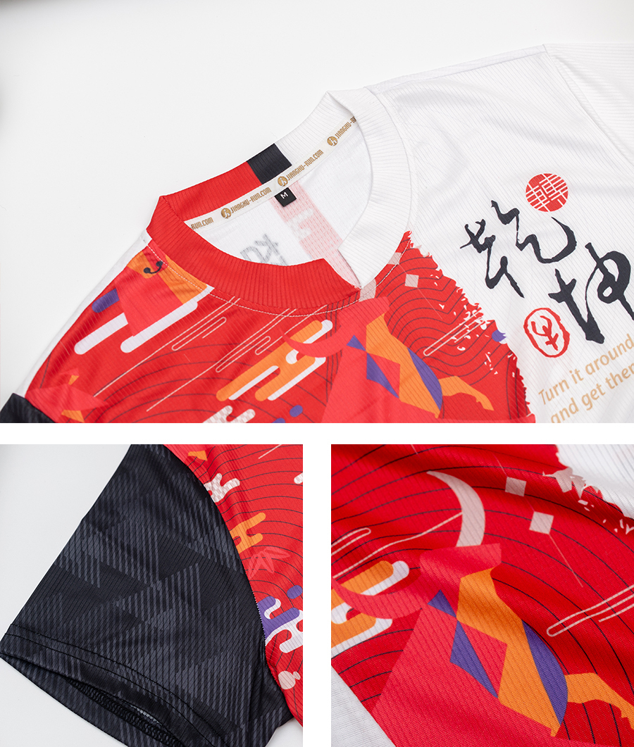 《牛轉乾坤》系列:正面大身(跑服:正面及袖子背心:正面)使用銀離子的紗線布料製作而成,安全/無皮膚刺激性過敏。背面使用細緻電腦緹花布,具美觀、輕簿、且延展更佳的特性,讓汗水蒸發更快速,並使用日本大和化工抗菌防臭技術處理。