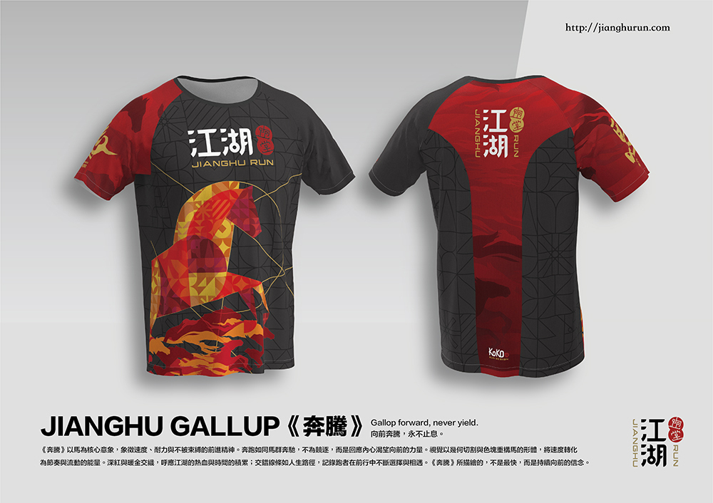 視覺以幾何切割與色塊重構馬的形體,將速度轉化為節奏與流動的能量。深紅與暖金交織,呼應江湖的熱血與時間的積累;交錯線條如人生路徑,記錄跑者在前行中不斷選擇與相遇
