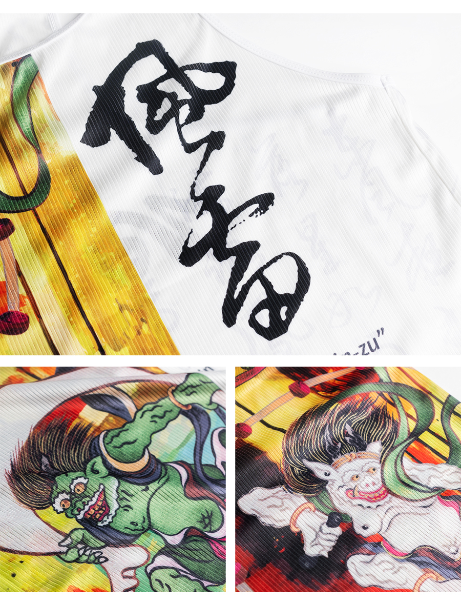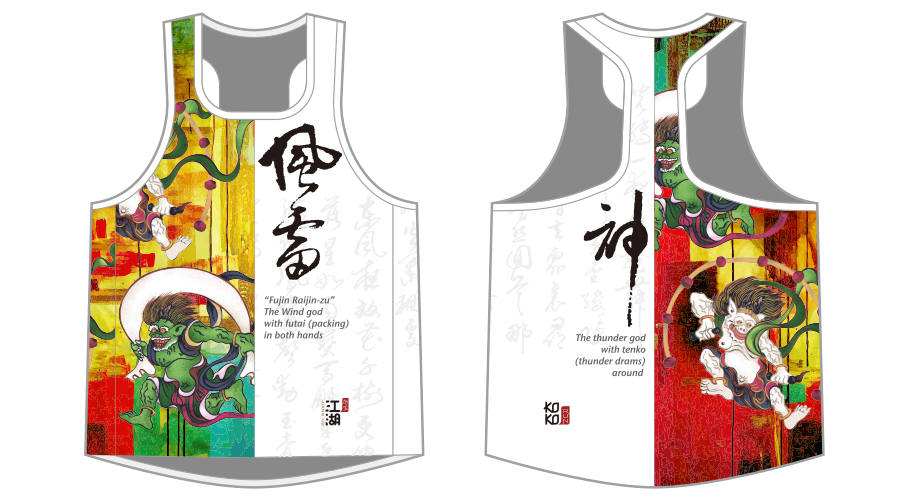 《神行》運動背心-風神與雷神,臨摹了風神雷神圖屏的畫風,搭配彩繪背景再創作,讓色彩更加現代而豐富,也讓運動的形象更加鮮明而突出。