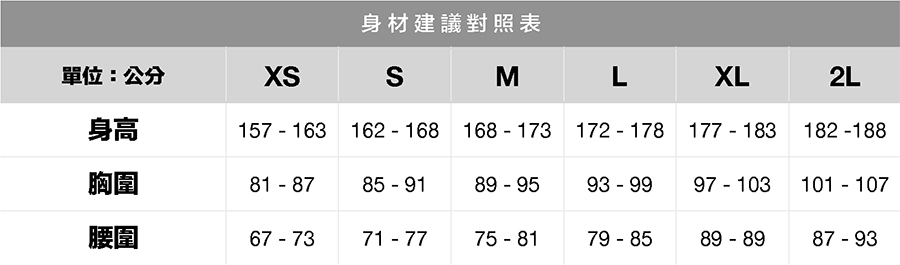 .本表為使用者的身材建議對照表,非商品尺寸表。
