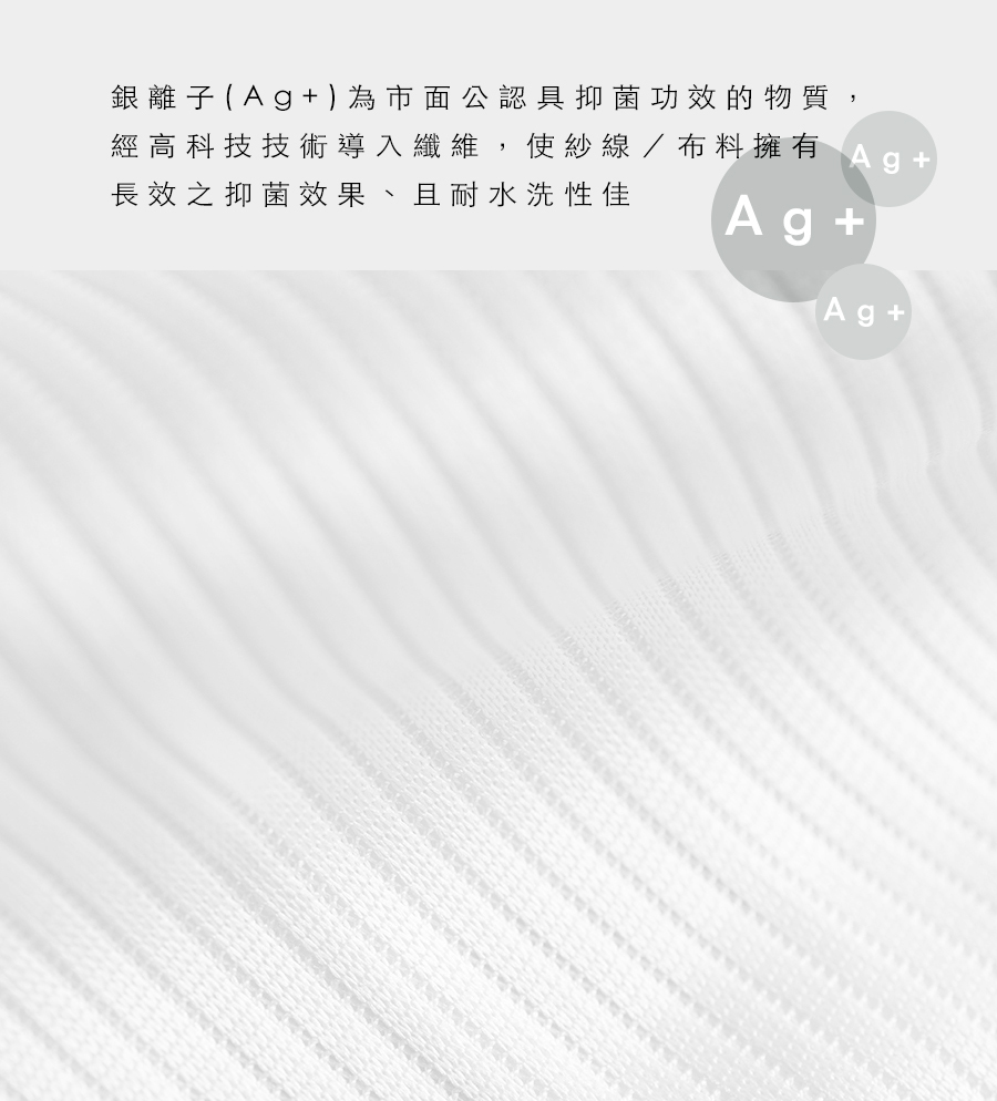 彈性良好;整體細致柔軟、吸溼排汗,讓穿著的舒適性更加提升;本款以含抑菌銀離子的紗線布料製作而成,安全/無皮膚刺激性過敏。