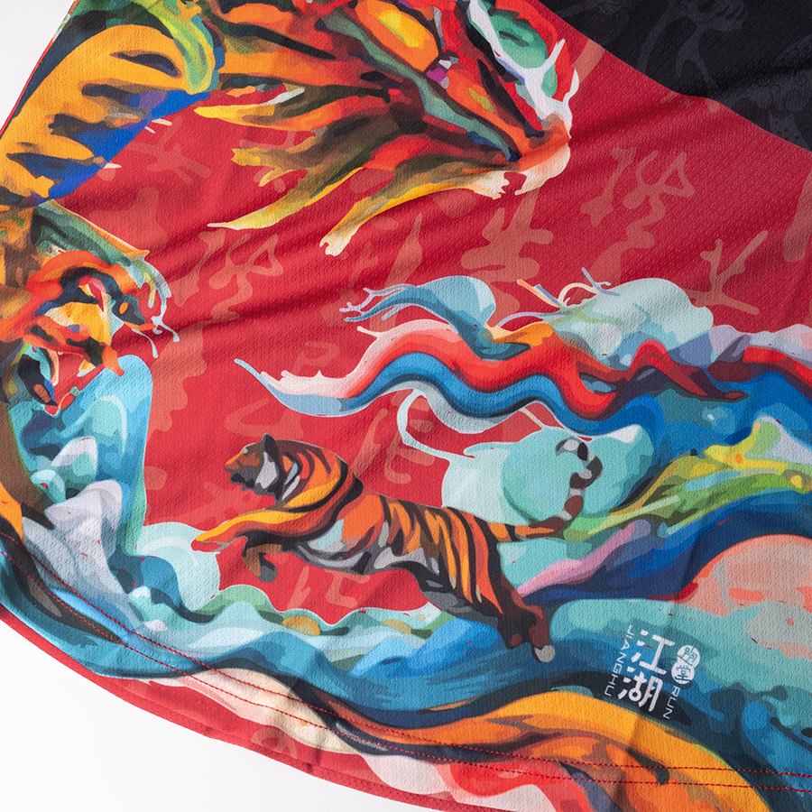 背身的四神雲氣圖,靈感源自漢代圖騰,以雅致色調巧妙融合於整體設計,讓厚重的古典紋飾呈現出輕盈而飄逸的風格。江湖跑堂期望,透過這些設計細節,讓每位運動者都能自信地展現自我,將文化底蘊融入運動美學之中。