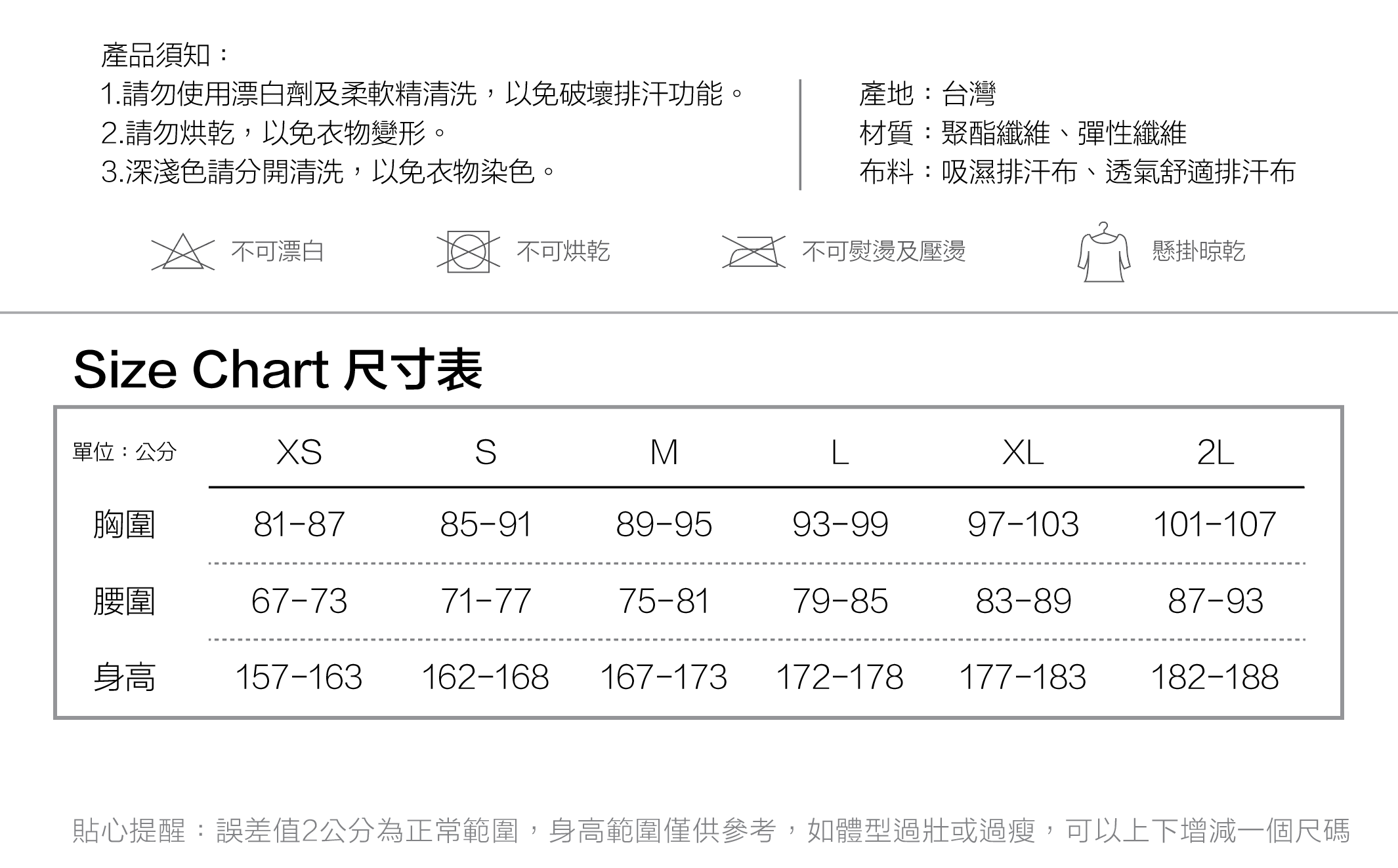 .尺寸表為捲尺繞身實際丈量,以公分(cm)為單位。